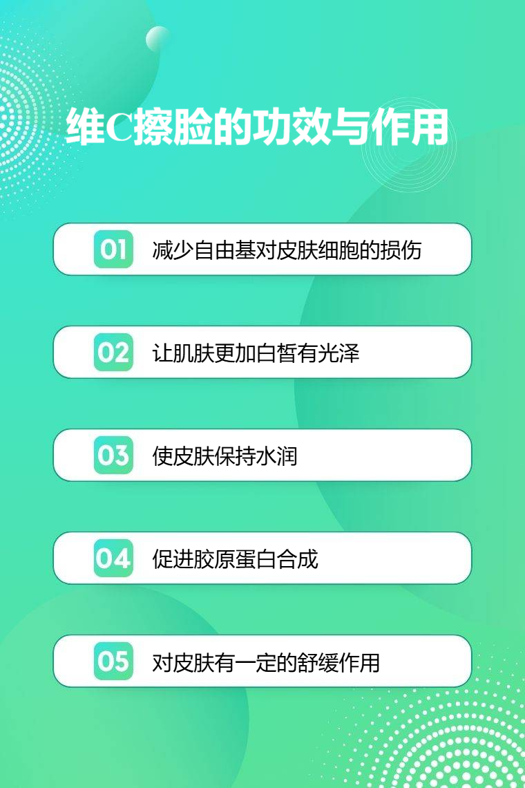维C擦脸具有抗氧化、美白、保湿、促进胶原蛋白合成、舒缓肌肤等功效与作用。