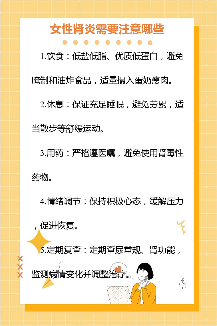 女性肾炎需要注意饮食、休息、用药、情绪调节、定期复查等。