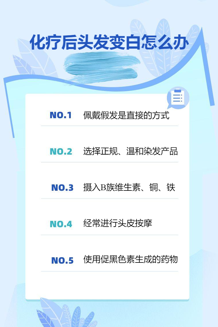 化疗后头发变白可通过佩戴假发、使用染发产品、饮食调理、头皮按摩、药物治疗等改善。
