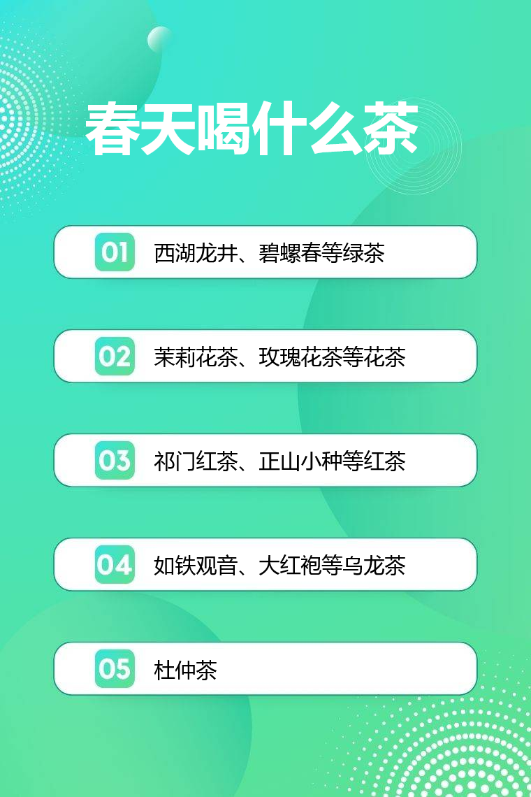 春天适合喝的茶有绿茶、花茶、红茶、乌龙茶、杜仲茶等。