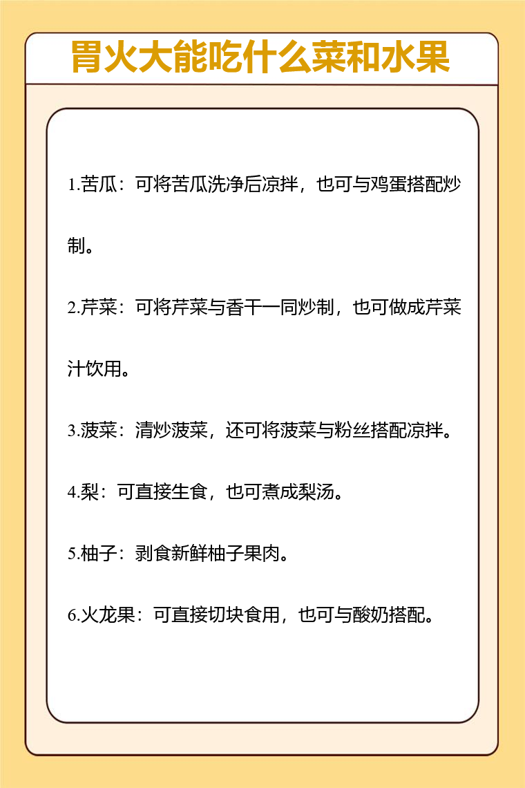 胃火大的人一般能吃的菜有苦瓜、芹菜、菠菜等,水果有梨、柚子、火龙果等。