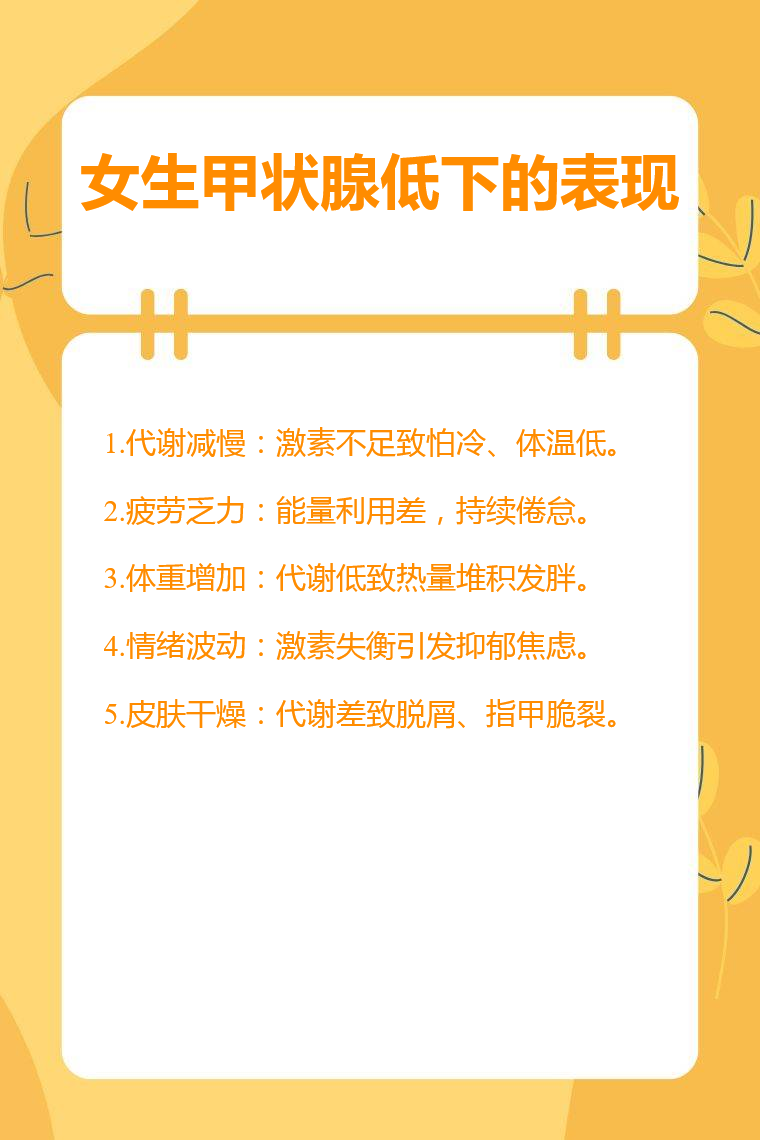 女生甲状腺低下的表现有代谢减慢、疲劳乏力、体重增加、情绪改变、皮肤问题等。