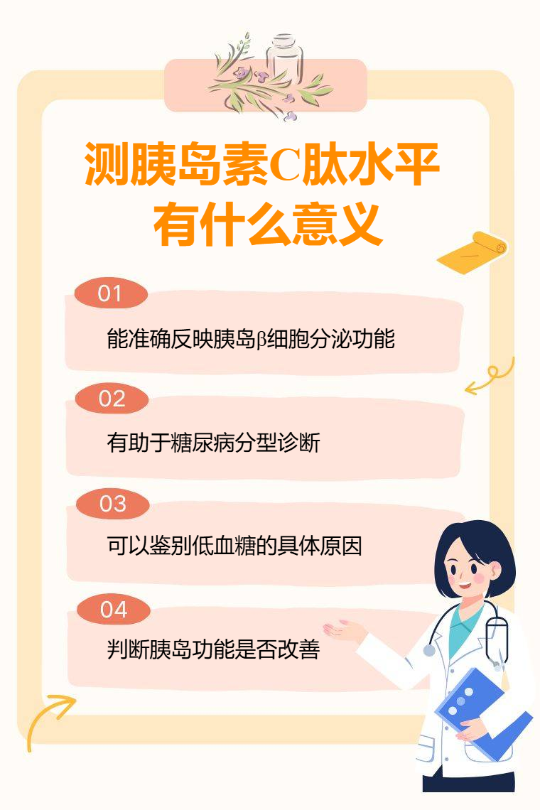测胰岛素C肽水平可用于评估胰岛功能、辅助诊断糖尿病、鉴别低血糖原因、监测糖尿病治疗效果等。