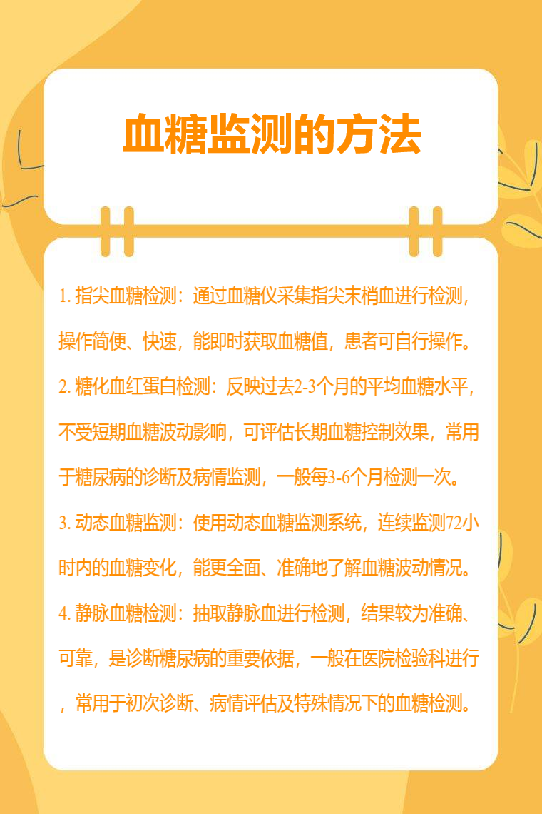 血糖监测方法有指尖血糖检测、糖化血红蛋白检测、动态血糖监测、静脉血糖检测等。