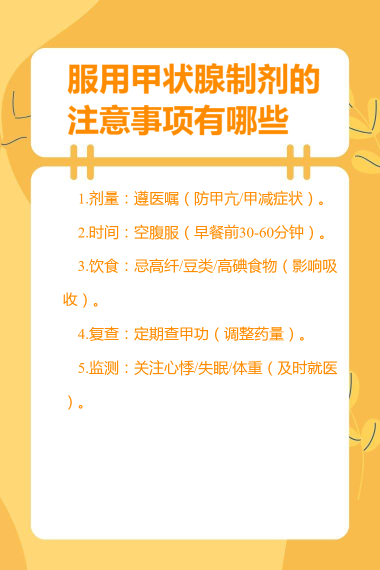 服用甲状腺制剂的注意事项包括药物剂量、服药时间、饮食禁忌、定期复查、不良反应监测等。