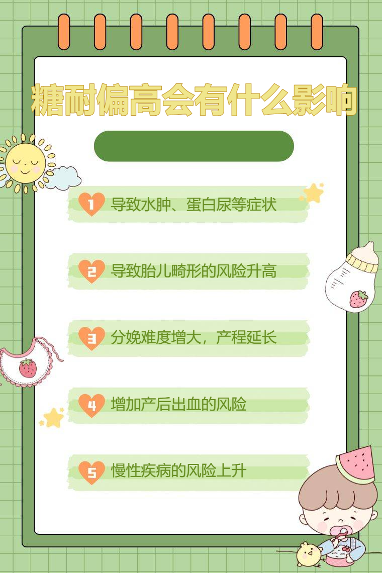 糖耐偏高会对孕妇自身、胎儿发育、分娩过程、产后恢复以及远期健康等产生影响。