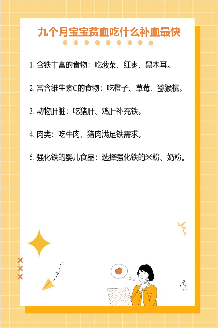 九个月宝宝贫血可通过食用含铁丰富的食物、富含维生素C的食物、动物肝脏、肉类、强化铁的婴儿食品等来补血。