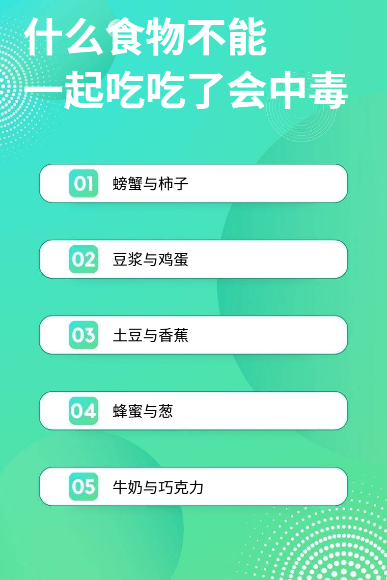 螃蟹与柿子、豆浆与鸡蛋、土豆与香蕉、蜂蜜与葱、牛奶与巧克力等食物不能一起吃,否则可能会引发中毒或不适。