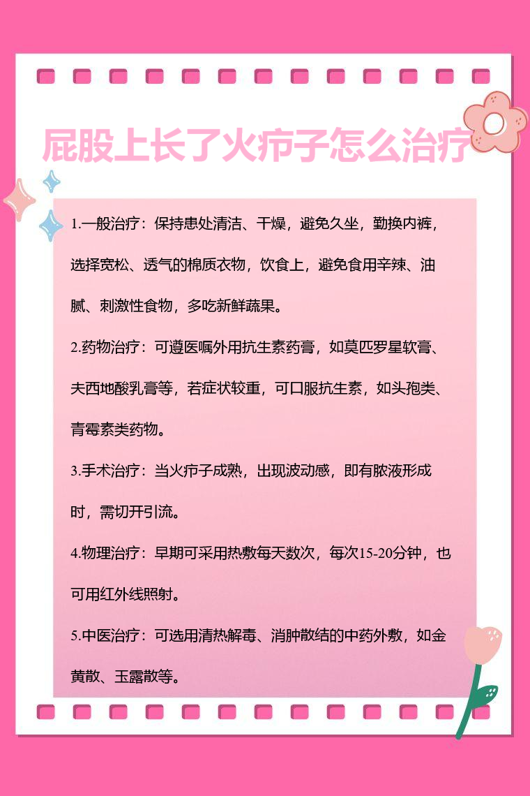 屁股上长了火疖子可通过一般治疗、药物治疗、手术治疗、物理治疗、中医治疗等方法进行治疗。