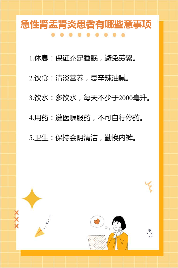 急性肾盂肾炎患者的注意事项包括休息、饮食、饮水、用药、卫生等。