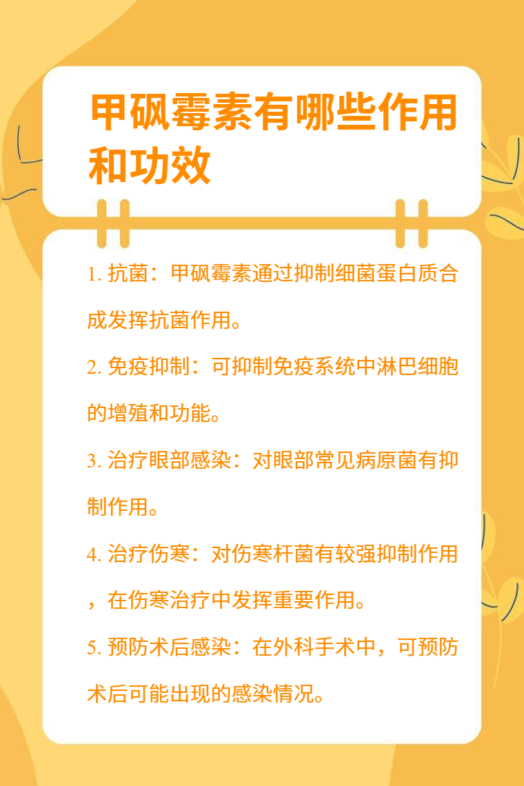 甲砜霉素有抗菌、免疫抑制、治疗眼部感染、治疗伤寒及预防术后感染等作用。
