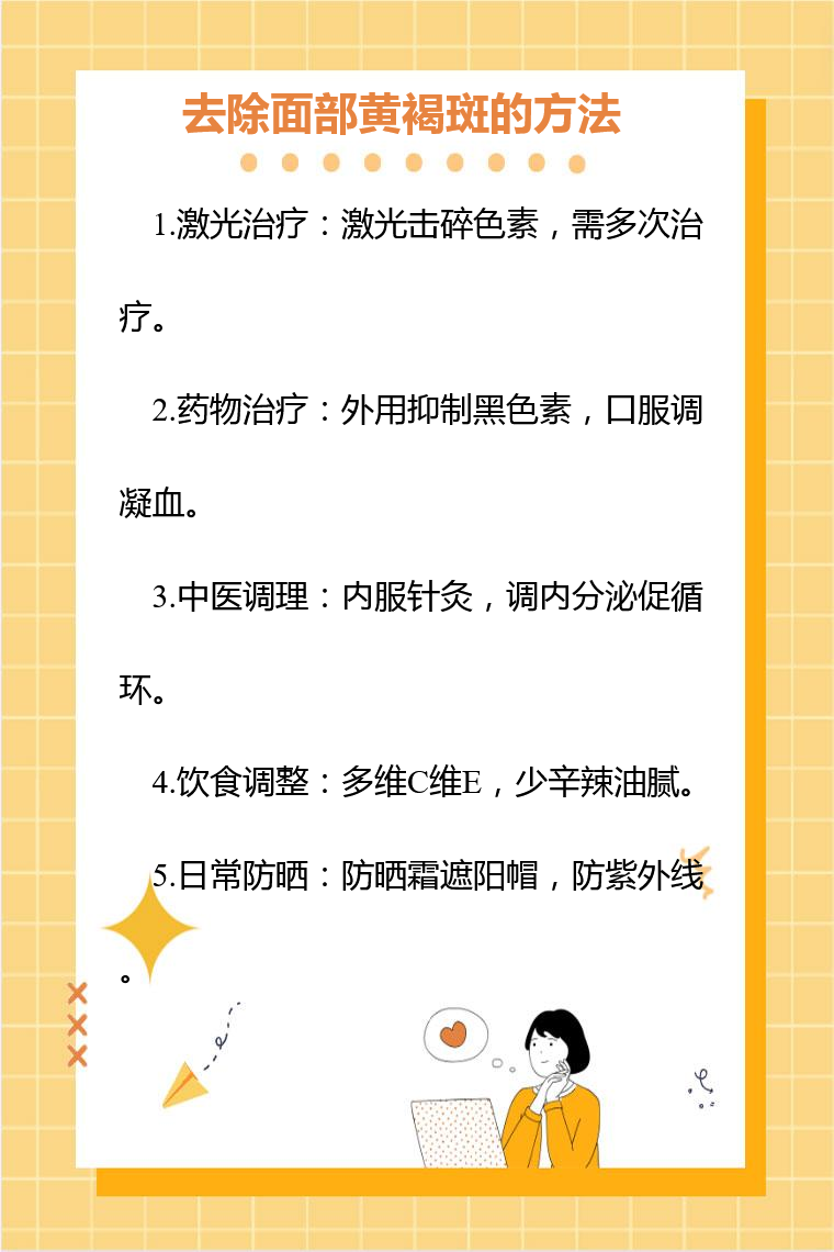 去除面部黄褐斑的方法有激光治疗、药物治疗、中医调理、饮食调整、日常防晒等。