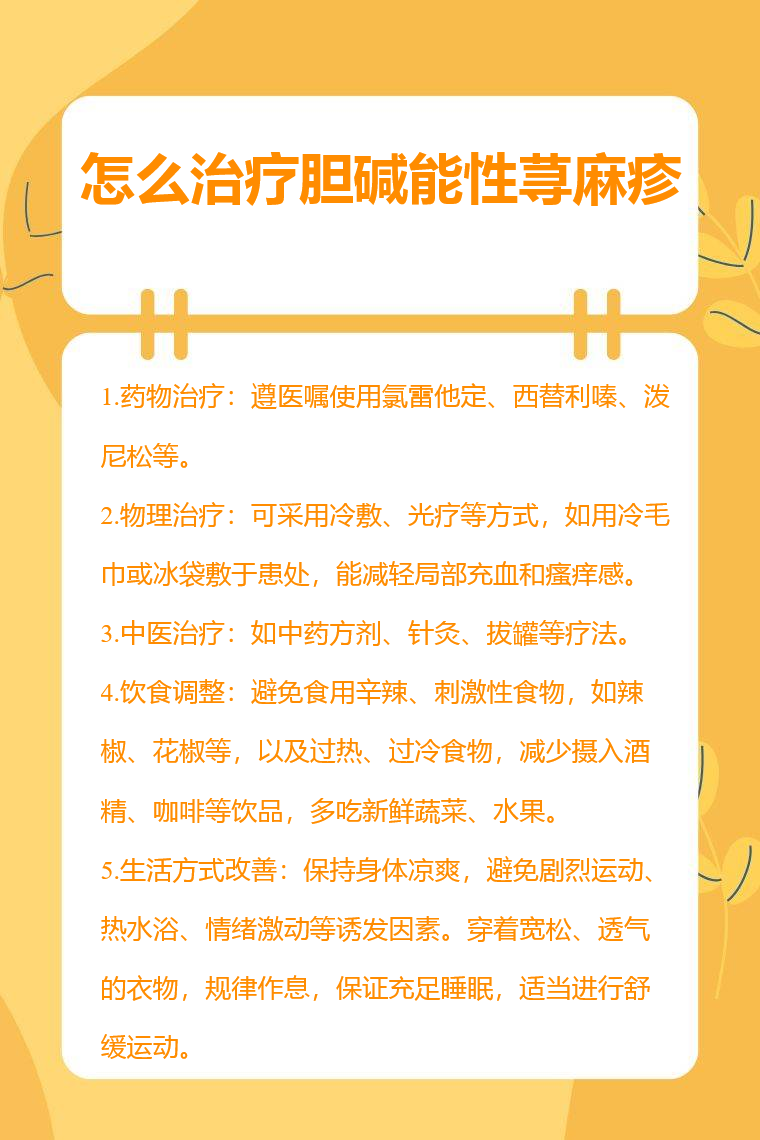 治疗胆碱能性荨麻疹的方法有药物治疗、物理治疗、中医治疗、饮食调整、生活方式改善等。