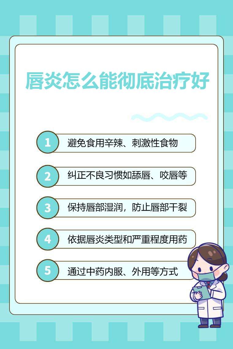 唇炎的彻底治疗可通过调整饮食、纠正不良习惯、做好唇部护理、药物治疗、中医调理等。