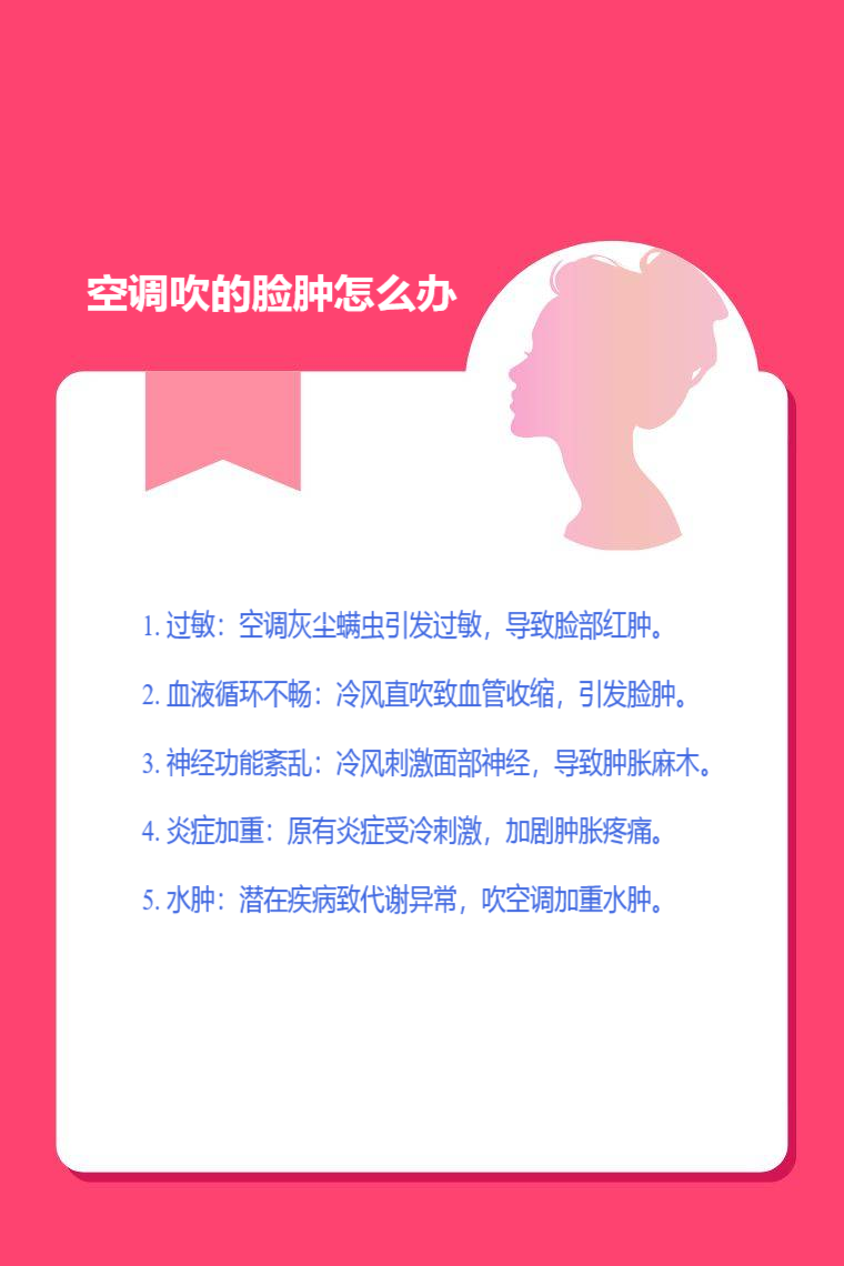 空调吹的脸肿可能由过敏、血液循环不畅、神经功能紊乱、炎症加重、水肿等情况引起等。