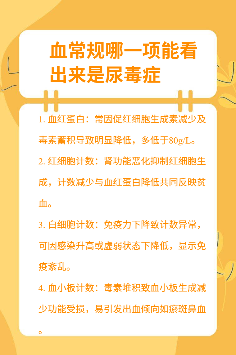 血常规中血红蛋白、红细胞计数、白细胞计数、血小板计数等项目可在一定程度上辅助判断是否可能存在尿毒症。