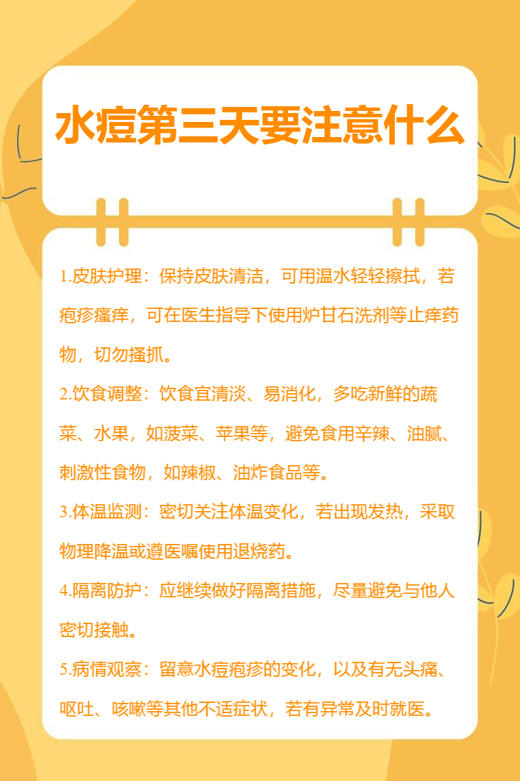 水痘第三天要注意皮肤护理、饮食调整、体温监测、隔离防护、病情观察等。
