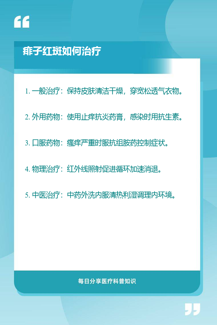 1. 一般治疗:保持皮肤清洁干燥,用温水清洗患处,避免用热水和刺激性强的肥皂。穿宽松、透气的棉质衣物,利于汗液蒸发。降低环境温度和湿度,可使用空调等调节,减少出汗。避免搔抓,防止皮肤破损引发感染。
