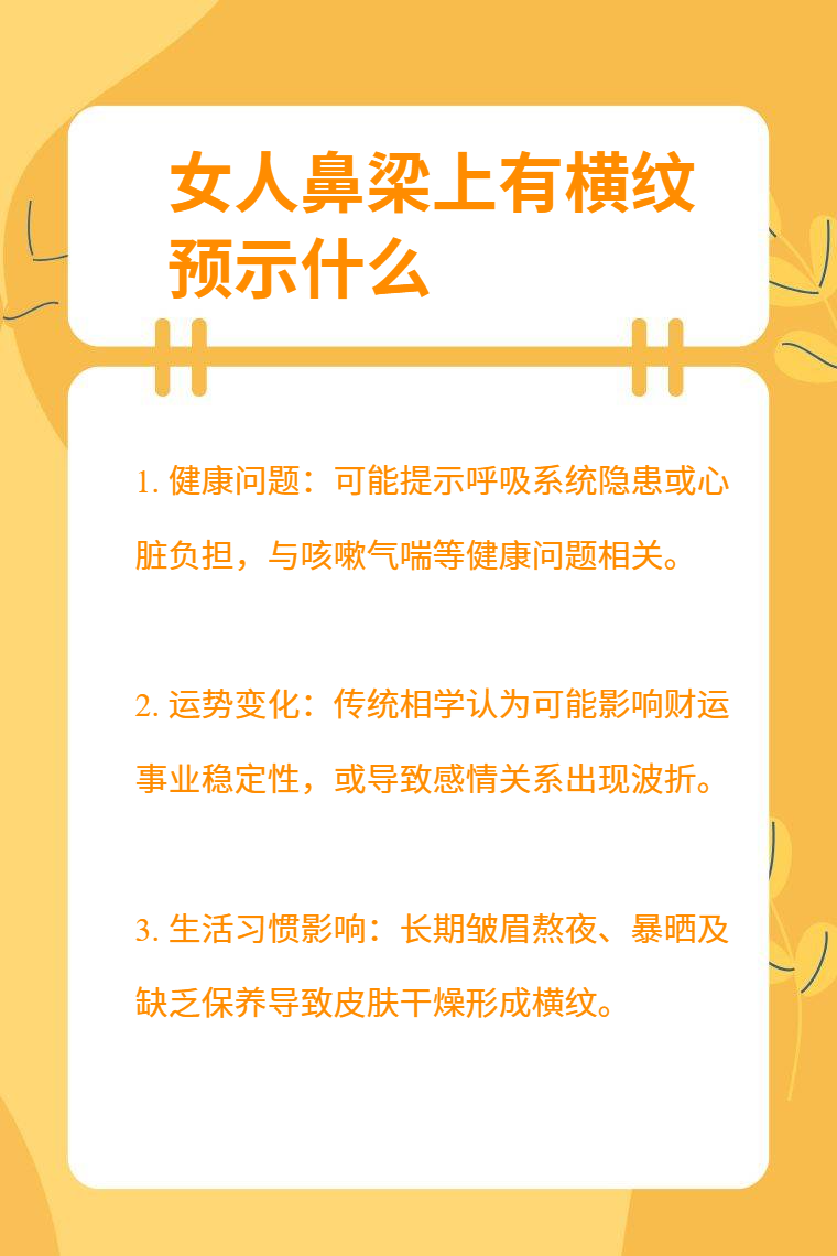 1. 健康问题:鼻梁对应人体的一些脏腑器官,出现横纹可能暗示呼吸系统存在隐患,比如容易出现咳嗽、气喘等呼吸道疾病;也可能与心脏功能有关,提示心脏负担较重或有潜在的心脏方面问题,长期的不良健康状况在面部有所体现。