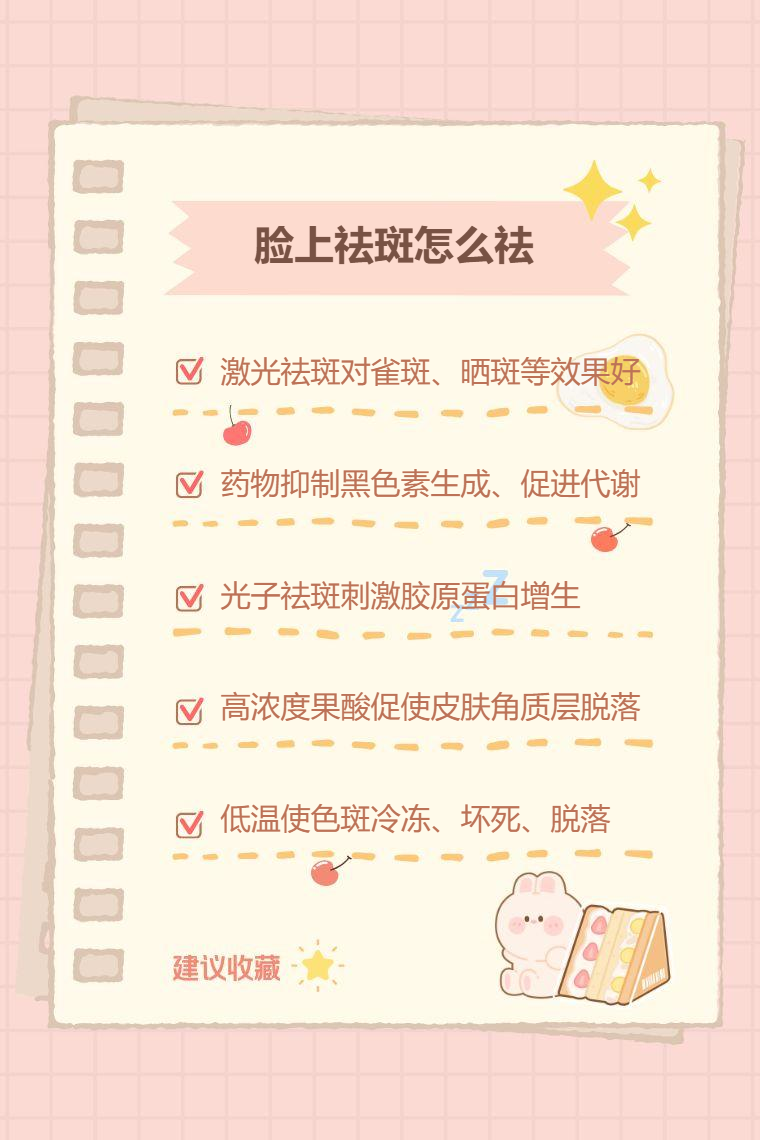 激光祛斑、药物祛斑、光子祛斑、果酸换肤祛斑、冷冻祛斑等是脸上祛斑的常见方式。