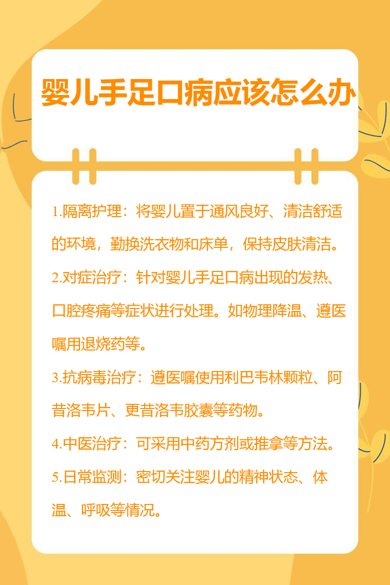 婴儿手足口病可通过隔离护理、对症治疗、抗病毒治疗、中医治疗、日常监测等方法应对。