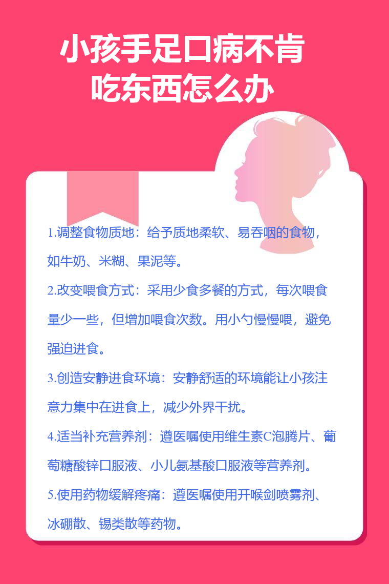 小孩手足口病不肯吃东西可通过调整食物质地、改变喂食方式、创造安静进食环境、适当补充营养剂、使用药物缓解疼痛等方法来解决。