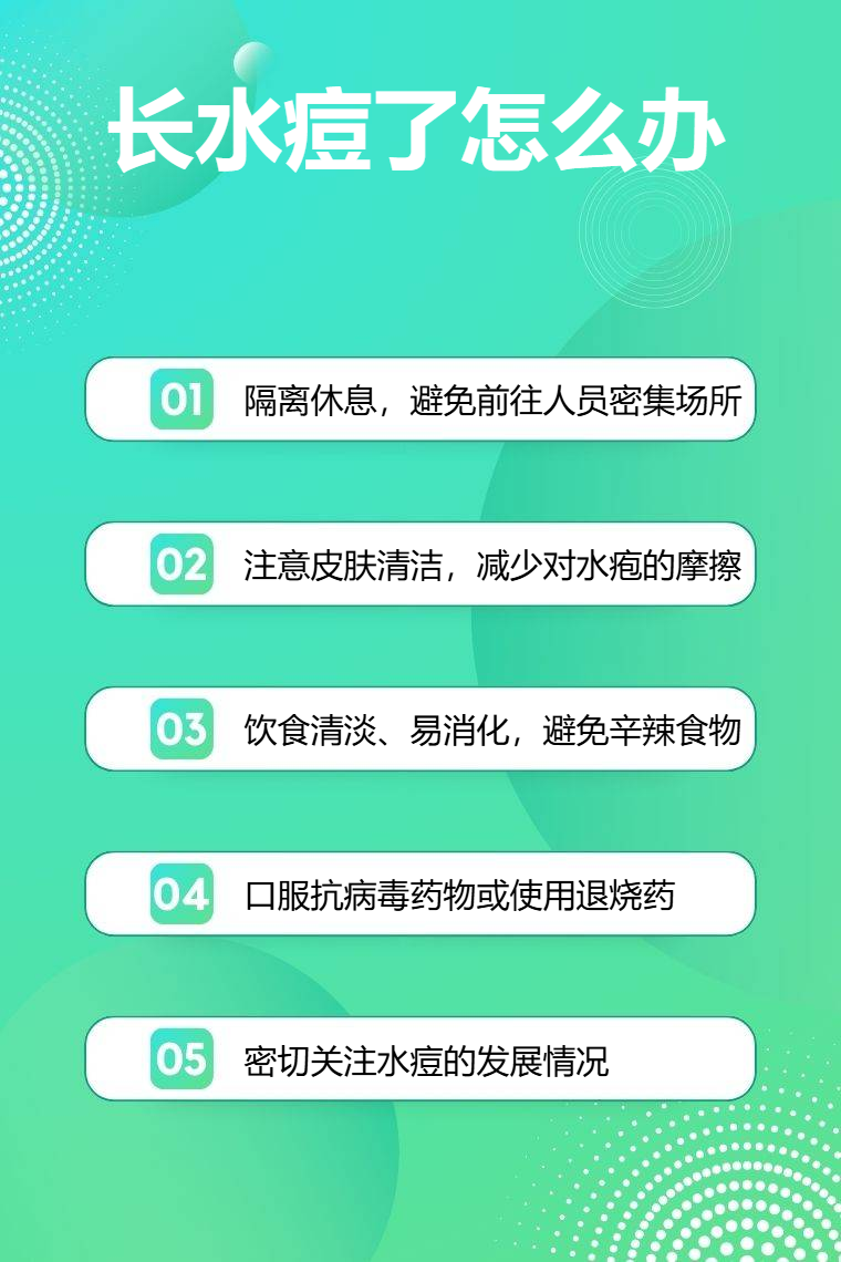 5. 监测病情:密切关注水痘的发展情况,包括水疱数量、大小、是否破溃,以及体温、精神状态等。若出现高热不退、头痛、呕吐、呼吸困难等异常症状,应及时就医。
