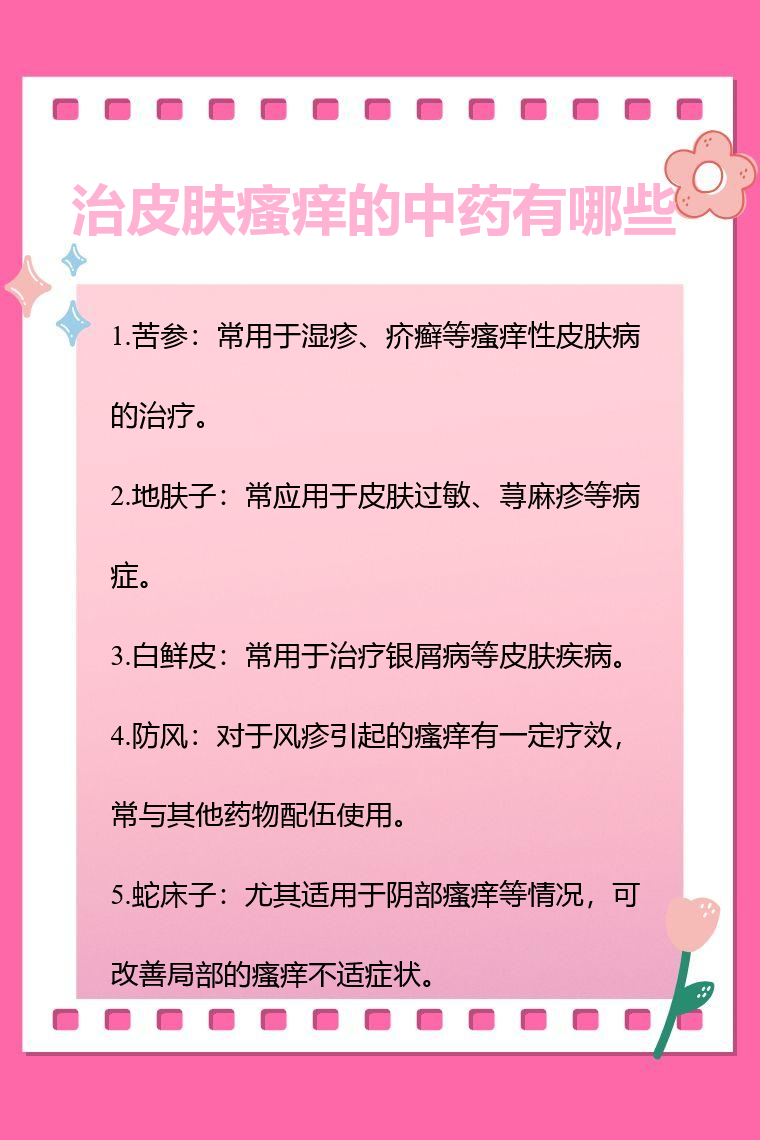 治疗皮肤瘙痒的中药有苦参、地肤子、白鲜皮、防风、蛇床子等。
