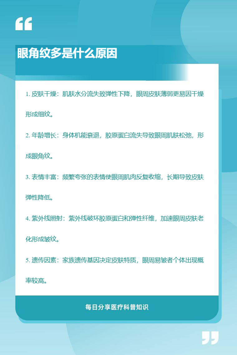眼角纹多的原因有皮肤干燥、年龄增长、表情丰富、紫外线照射、遗传因素等。