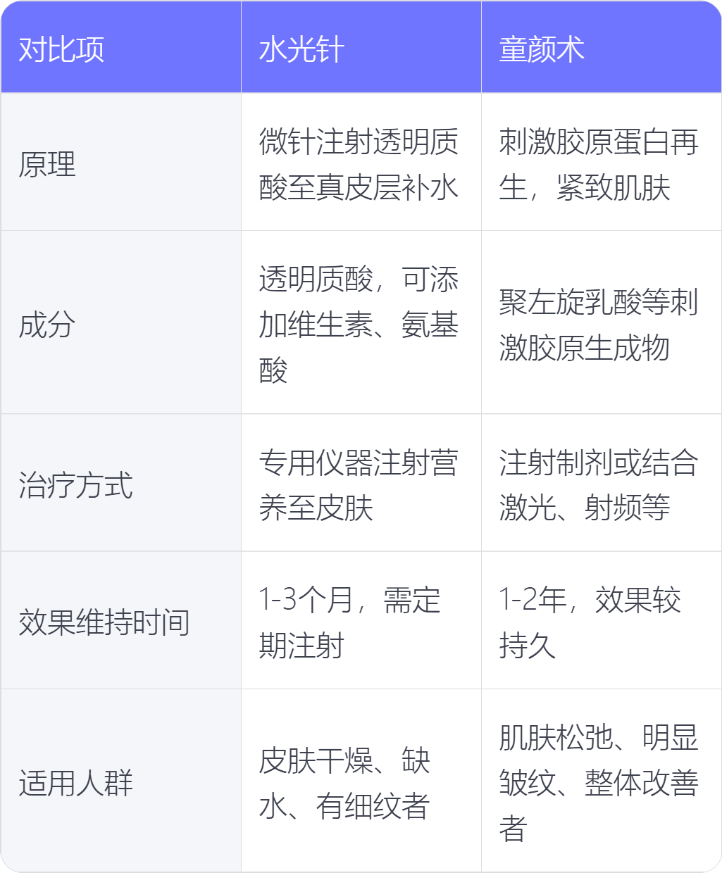 水光针和童颜术在原理、成分、治疗方式、效果维持时间、适用人群方面存在不同。