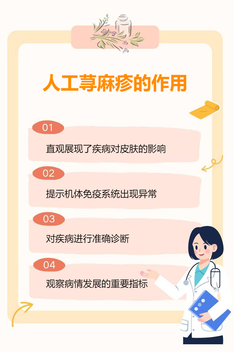 人工荨麻疹的作用包括皮肤症状表现、提示免疫异常、辅助疾病诊断、反映病情变化等。