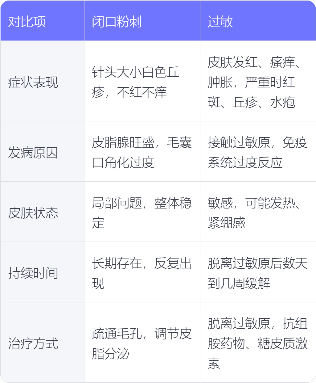 闭口粉刺与过敏在症状表现、发病原因、皮肤状态、持续时间、治疗方式上存在不同。