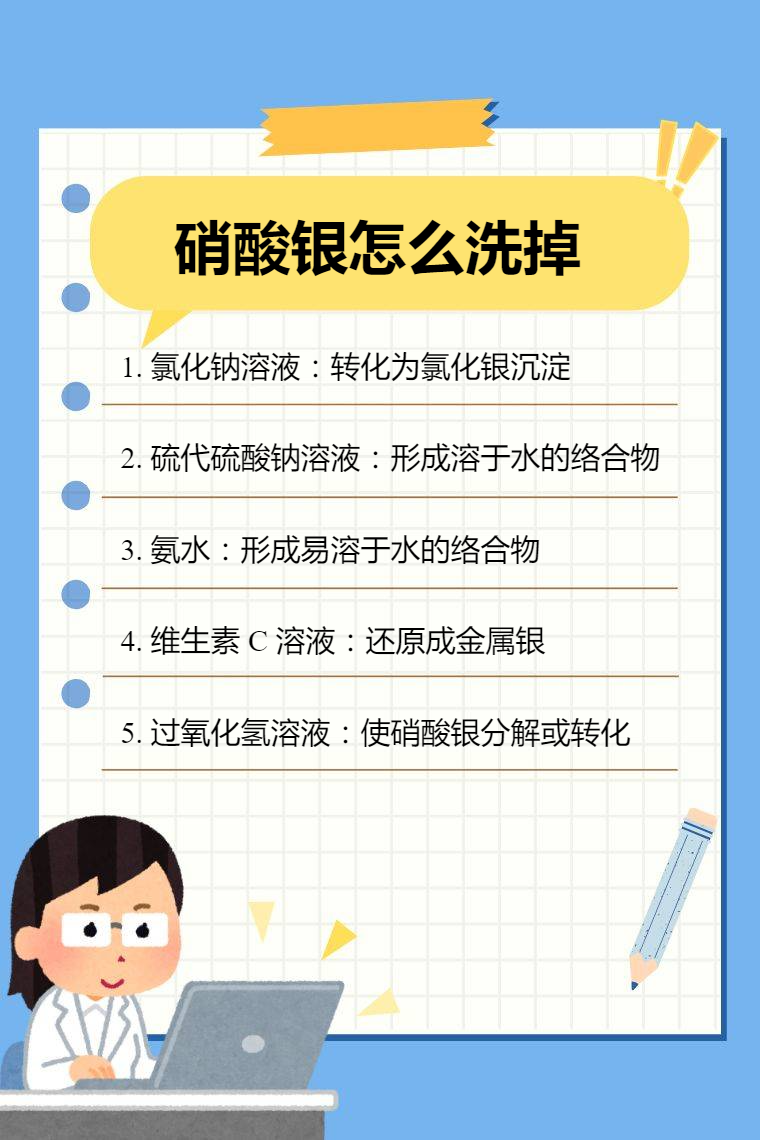 硝酸银可以通过使用氯化钠溶液、硫代硫酸钠溶液、氨水、维生素 C 溶液、过氧化氢溶液等洗掉。