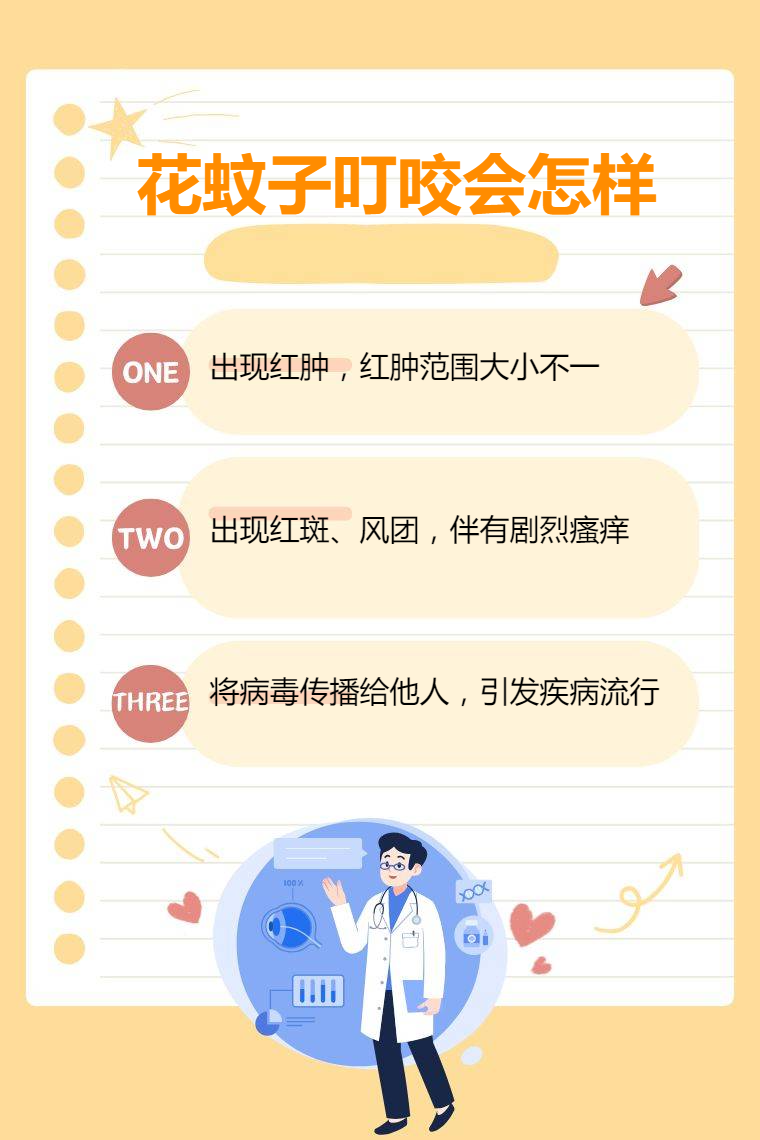 花蚊子叮咬会出现瘙痒红肿、过敏反应、传播疾病等。