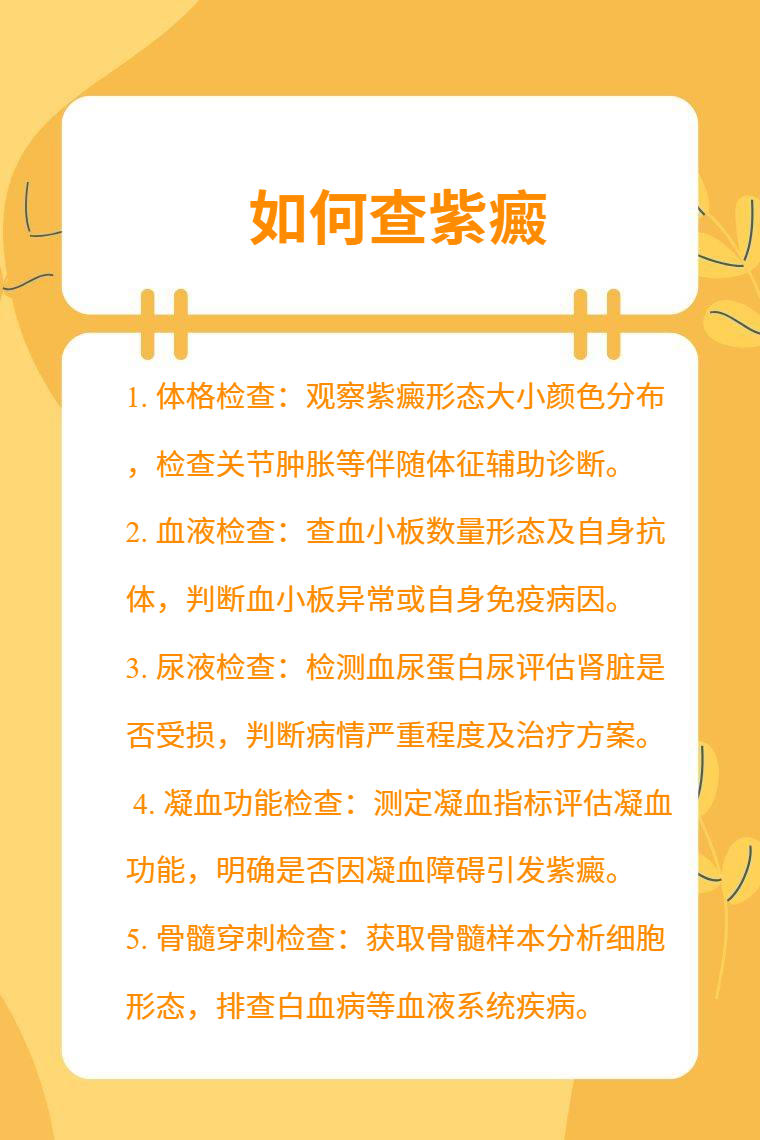 查紫癜的方式有体格检查、血液检查、尿液检查、凝血功能检查、骨髓穿刺检查等。