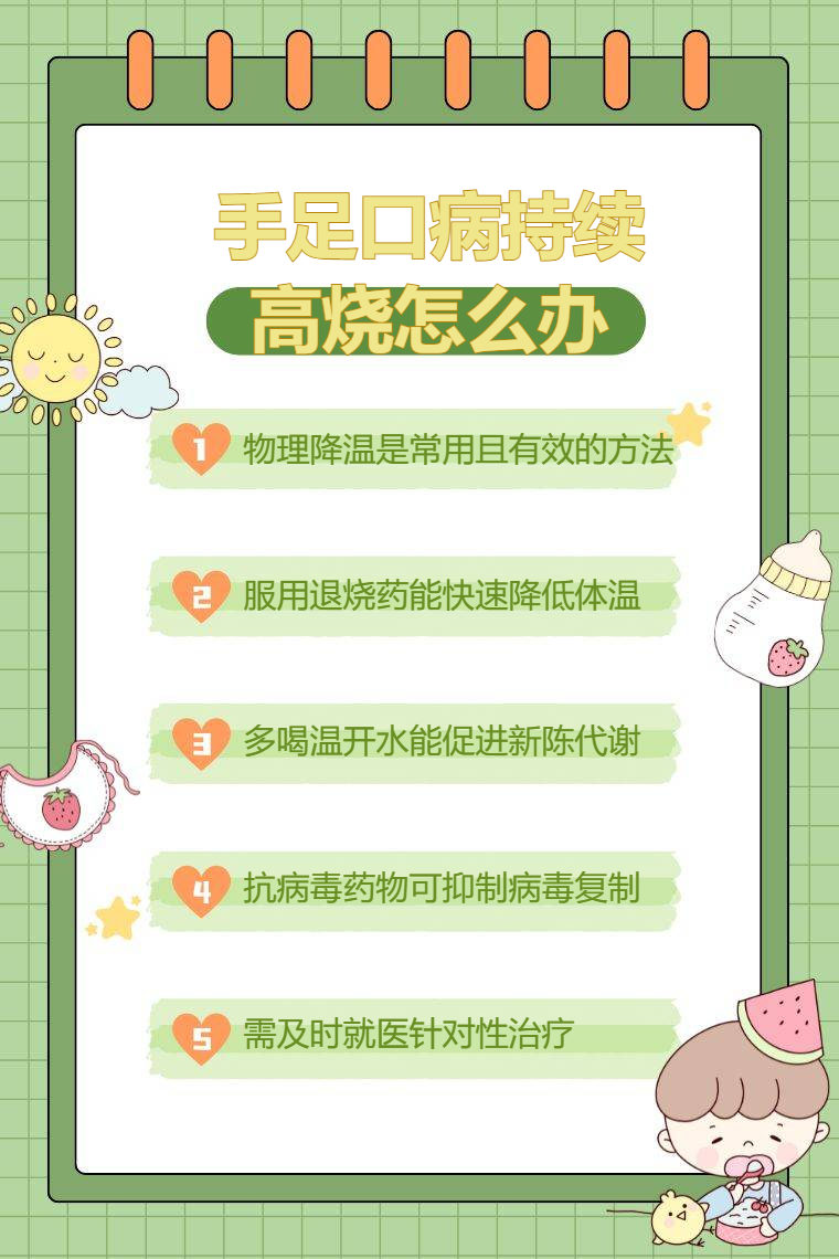 手足口病出现持续高烧可通过物理降温、服用退烧药、补充水分、使用抗病毒药物、就医住院治疗等方法应对。