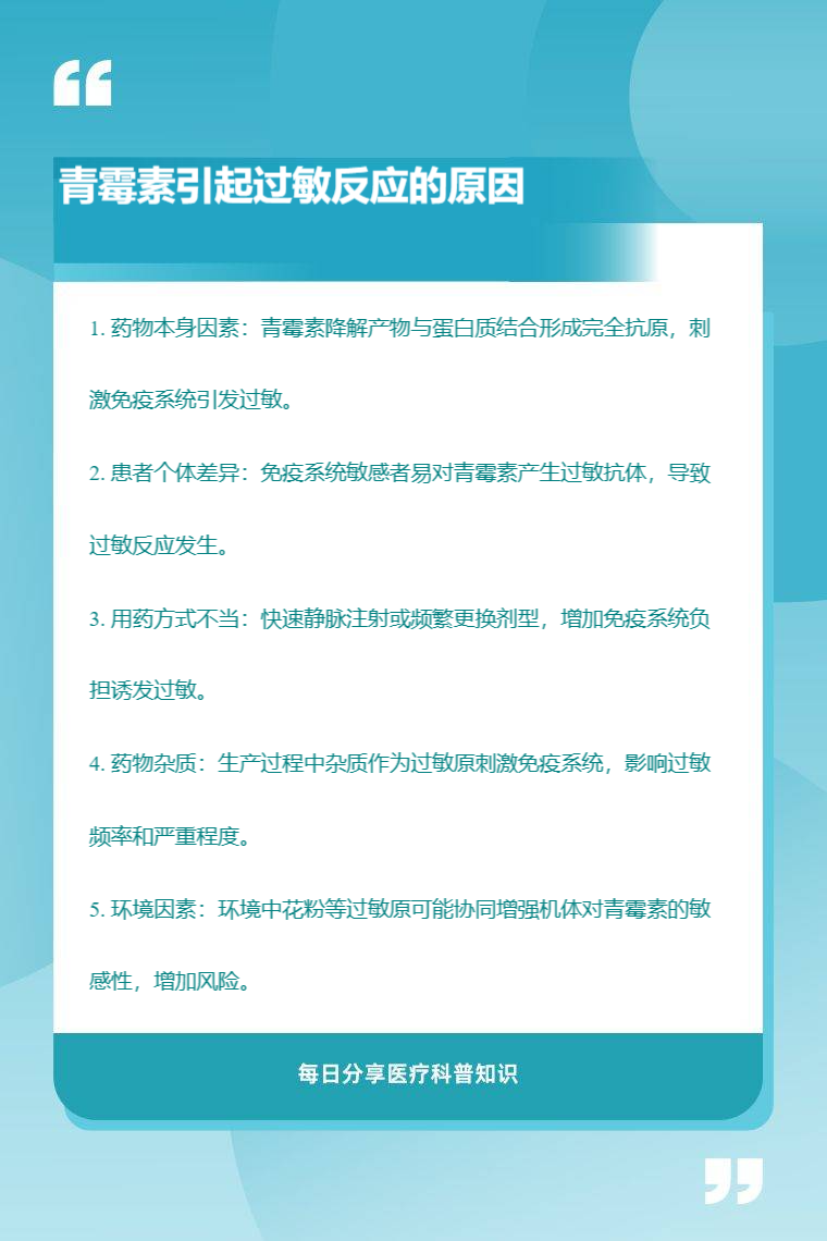 青霉素引起过敏反应的原因包括药物本身因素、患者个体差异、用药方式不当、药物杂质、环境因素等。