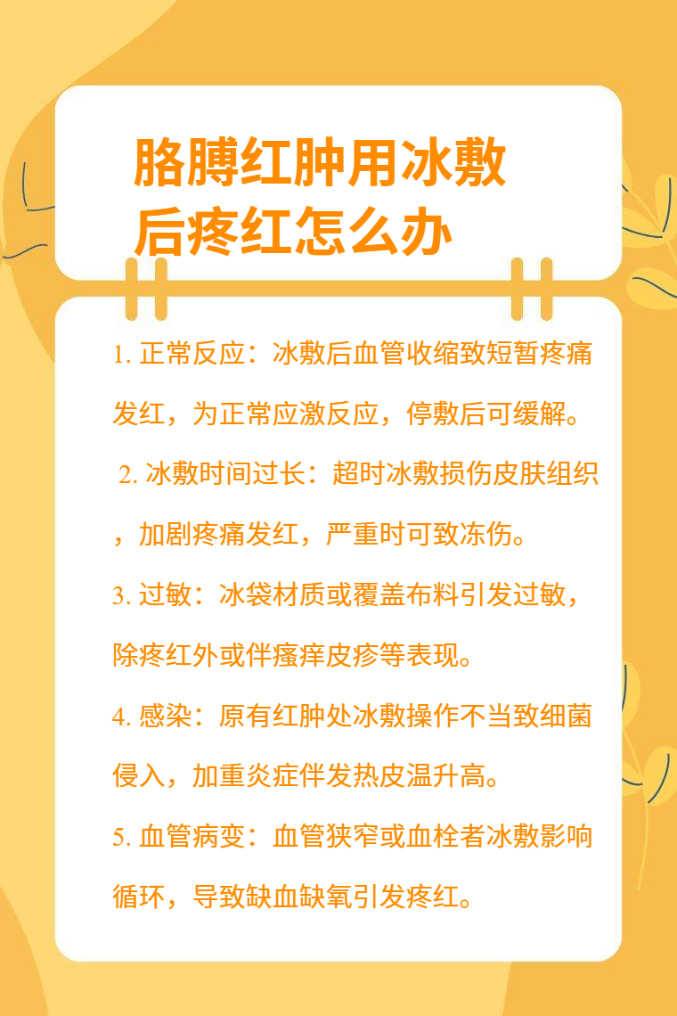 5. 血管病变:本身存在血管病变如血管狭窄、血栓形成等情况,冰敷刺激后影响血液循环,导致局部缺血、缺氧,引起疼痛和皮肤发红改变。