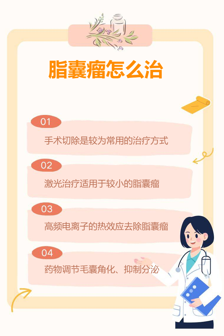 脂囊瘤的治疗方法有手术切除、激光治疗、电离子治疗、药物治疗等。