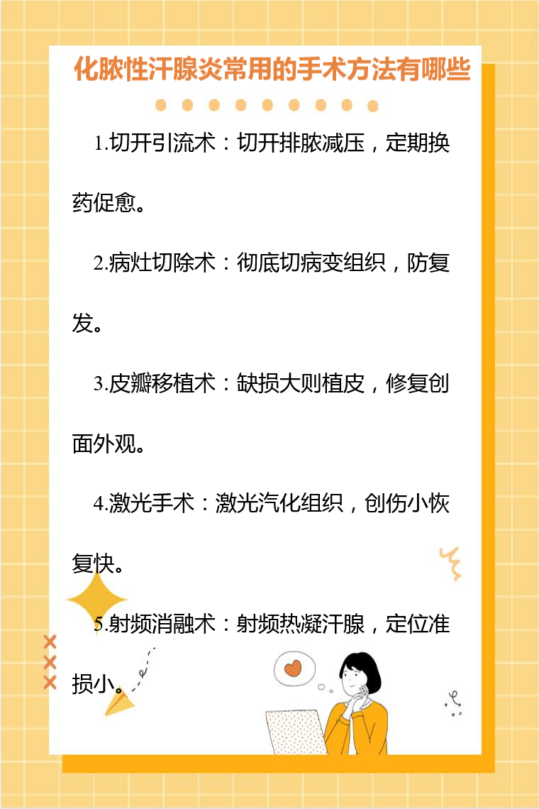 化脓性汗腺炎常用的手术方法包括切开引流术、病灶切除术、皮瓣移植术、激光手术、射频消融术等。