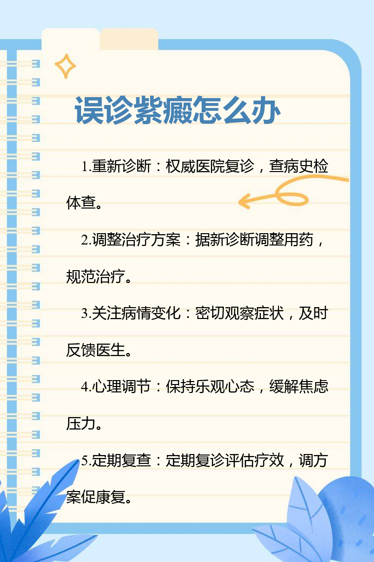 误诊紫癜可通过重新诊断、调整治疗方案、关注病情变化、心理调节、定期复查等方式应对。