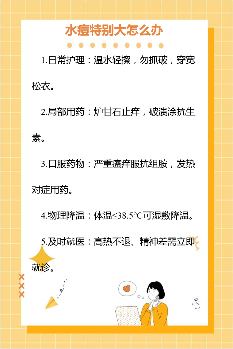 5. 及时就医:若水痘特别大且数量较多、伴有高热不退、精神萎靡、呼吸急促等症状,可能是出现了严重并发症,需及时前往医院就诊,进行相关检查和治疗。