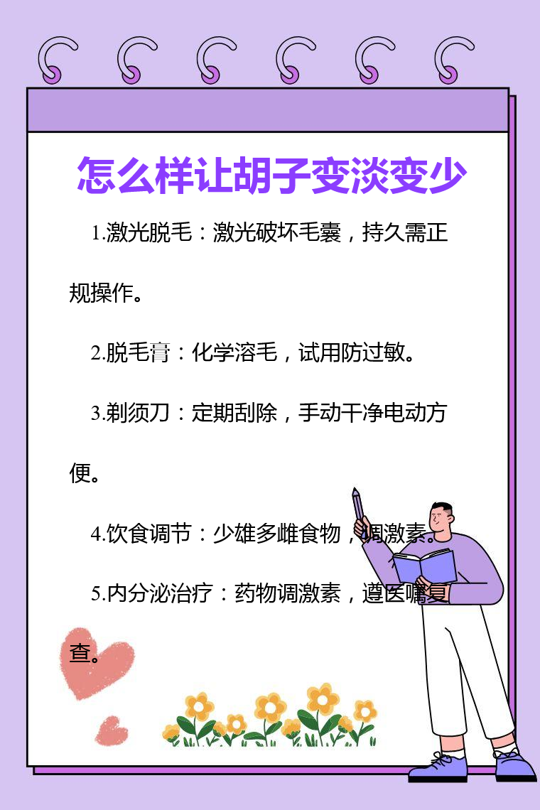 要让胡子变淡变少,需根据自身情况选择合适的方法。日常要注意保持良好的生活习惯,规律作息、适度运动、保持心情舒畅。若因疾病因素导致胡子异常生长,应及时就医,在专业医生的指导下进行治疗,不可自行盲目尝试不科学的方法,以免对身体造成不良影响 。