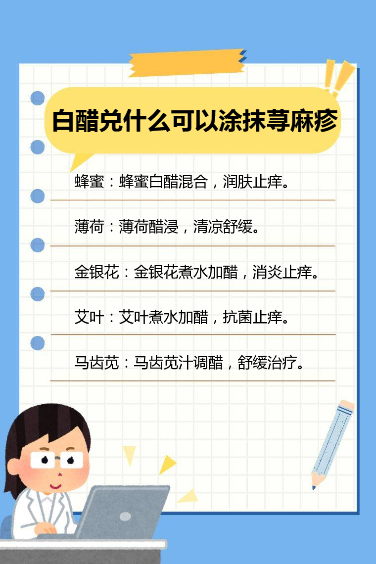 白醋可兑蜂蜜、薄荷、金银花、艾叶、马齿苋等用于涂抹荨麻疹。