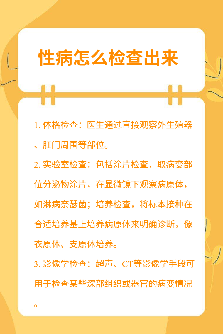 性病的检查方法有体格检查、实验室检查、影像学检查等。