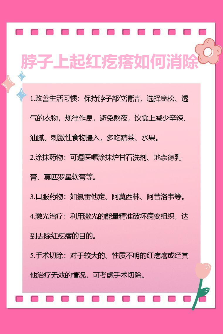 脖子上起红疙瘩可通过改善生活习惯、涂抹药物、口服药物、激光治疗、手术切除等消除。