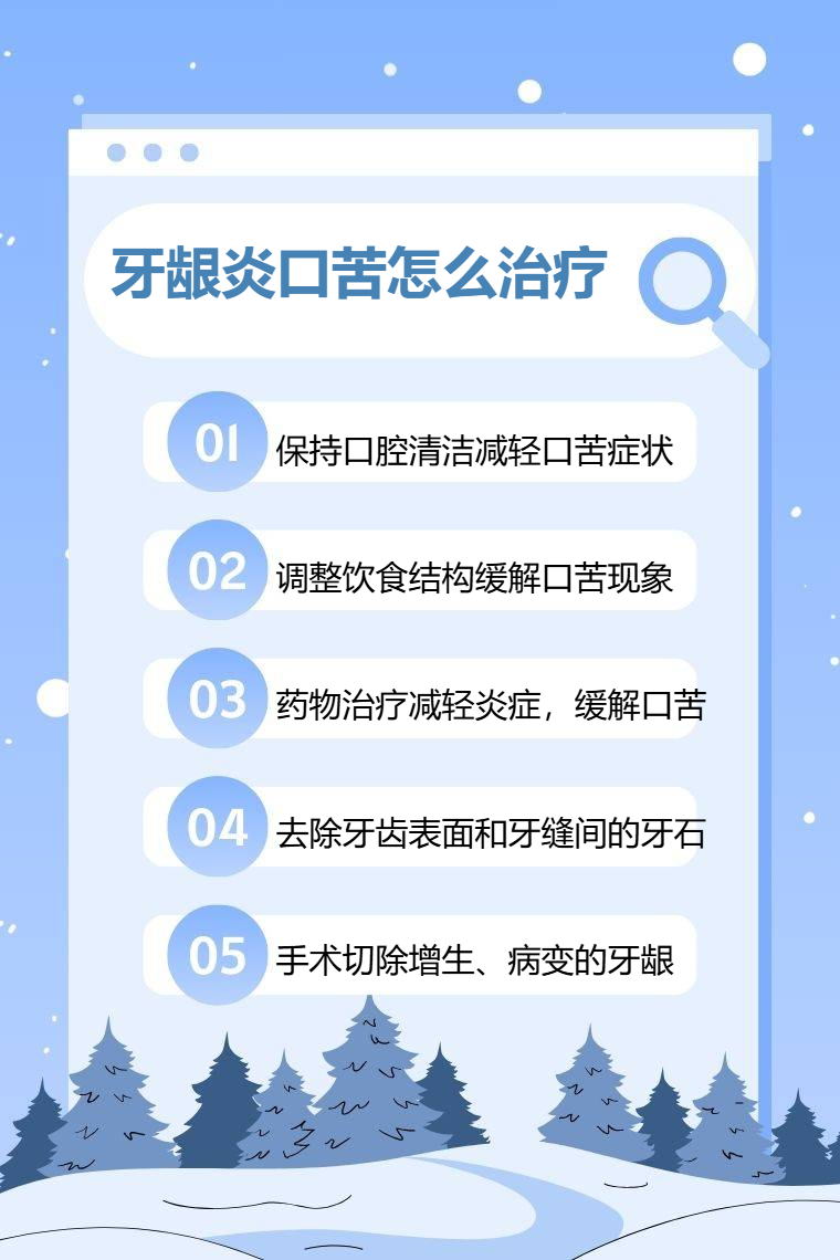 5. 手术治疗:对于病情严重、常规治疗效果不佳的牙龈炎口苦患者,可考虑手术治疗。如牙龈切除术等,通过手术切除增生、病变的牙龈组织,消除炎症病灶,促进牙龈组织恢复正常形态和功能,从根本上缓解牙龈炎,减轻口苦现象。