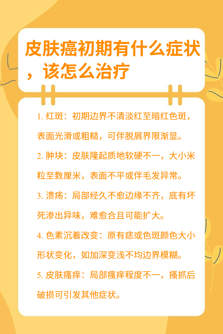 皮肤癌初期症状包括红斑、肿块、溃疡、色素沉着改变、皮肤瘙痒等。