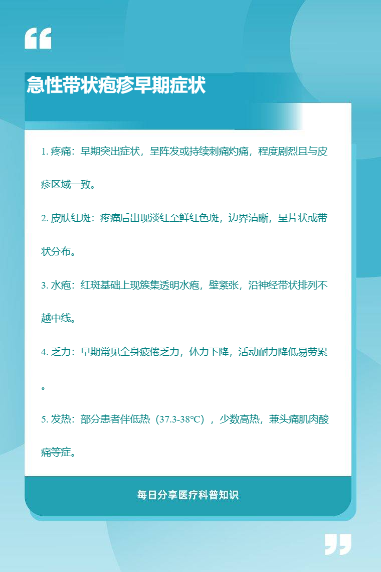 急性带状疱疹早期症状有疼痛、皮肤红斑、水疱、乏力、发热等。