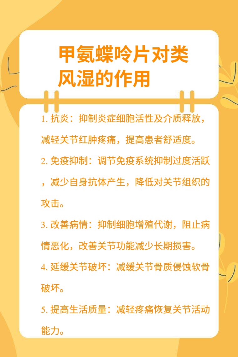 甲氨蝶呤片对类风湿具有抗炎、免疫抑制、改善病情、延缓关节破坏、提高生活质量等作用。
